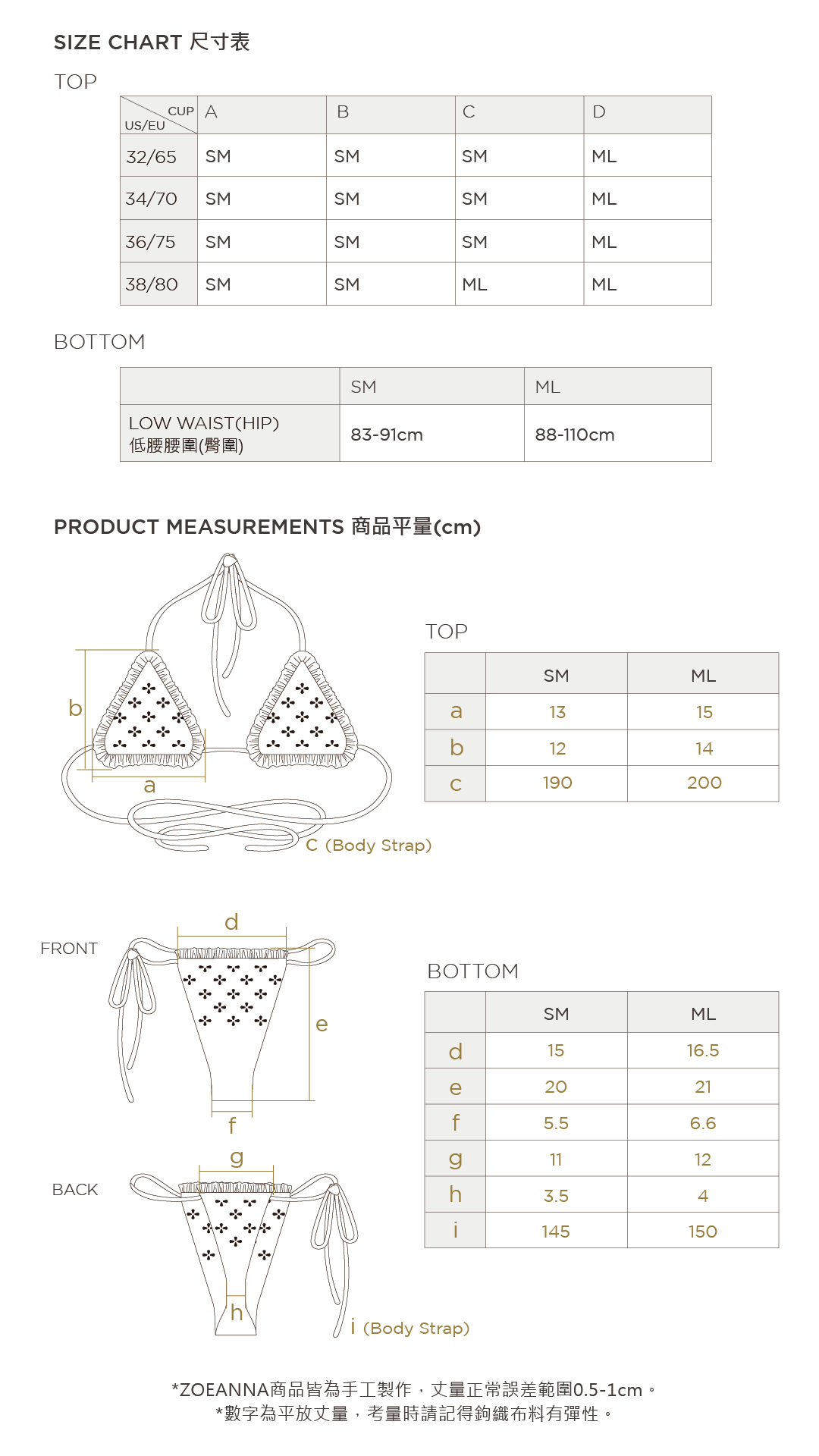 建議依照上方SIZE CHART中的「商品平量」選擇即可,以布片大小判斷喜愛的保守度 - 上下身綁帶皆可自由拉動調整